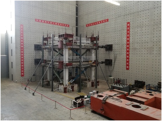 该验收试验为8层含屈曲约束支撑(BRB)框架双向足尺拟动力试验,其中底部两层为试验子结构。试验过程中,将采用2台控制器联合控制8套作动器协调加载。通过本次验收试验,能够对反力墙反力地板试验区液压与控制加载系统的作动器性能、多控制器协调加载、拟动力试验软件等进行验收。