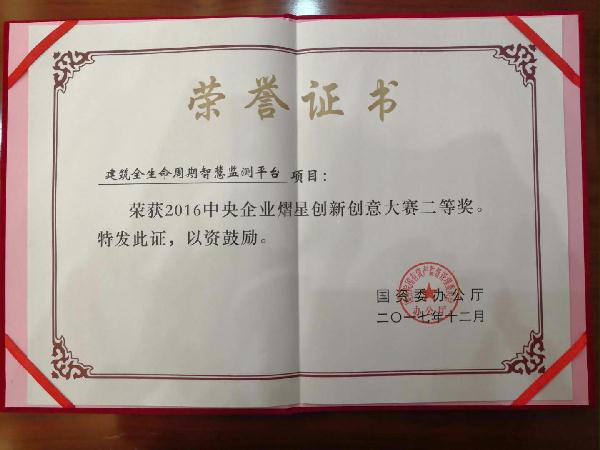 12月26日,2016中央企业熠星创新创意大赛总结大会在北京召开。大会评出一等奖20名,二等奖30名,三等奖40名,优秀奖100名。中国建筑技术中心“建筑全生命周期智慧监测平台”项目荣获二等奖第八名。